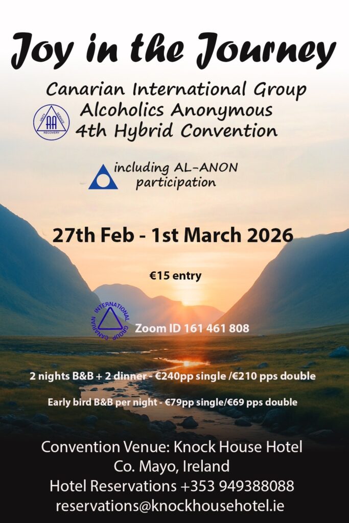 for membersNews Home > For Members > News > Canarian International Group 4th Hybrid Convention Canarian International Group 4th Hybrid ConventionPosted on November 18, 2025 Write content here … Recent posts Canarian International Group 4th Hybrid Convention AA Traditions Open Workshop 40th anniversary Celebration – Monday 12&12 INTERGROUP – Newsletter April 2025 INTERGROUP – Newsletter January 2025 AA NetherlandsAlcoholics Anonymous is a fellowship of people who share their experience, strength and hope with each other that they may solve their common problem and help others to recover from alcoholism. Canarian International Group 4th Hybrid Convention
